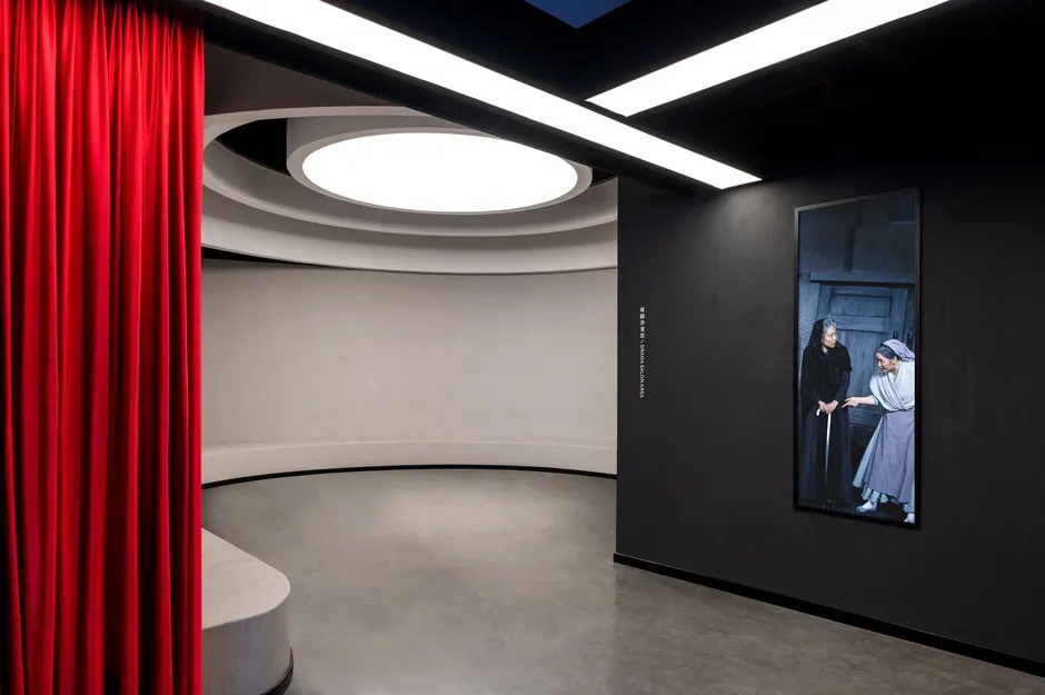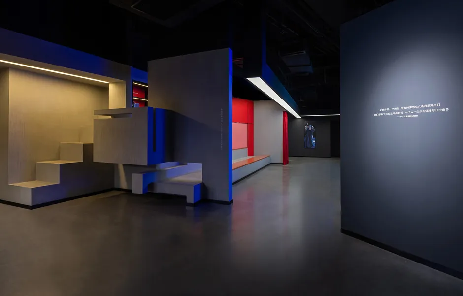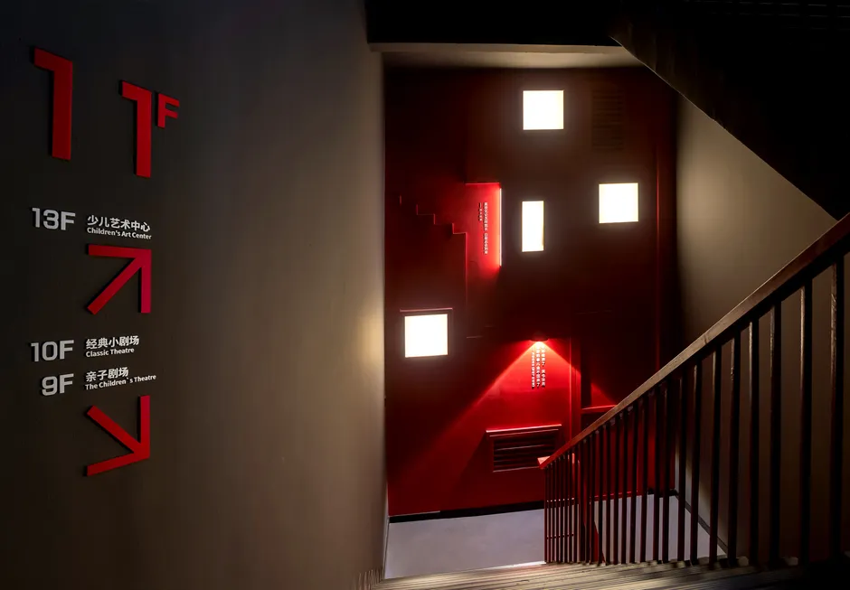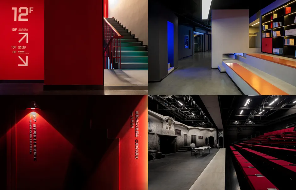 设计减少了空间的硬性分割,以软装饰手法灵活划分空间。空间以红黑为主色调,突出戏剧张力。同时,场馆的灯光颜色可根据不同时期的演出自由变换。为满足观众在观剧之外的美好体验,公共空间区域设置了接待区、戏剧咖啡区、戏剧书吧、戏剧创意产品展示区等。